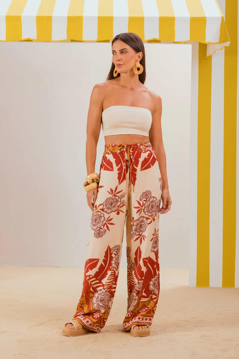 Calça pantalona cintura alta e fluida, com bolsos laterais e passante frontais que acompanha cinto fino. Disponível nas variantes Estampa floral azul, verde e vermelho terra.