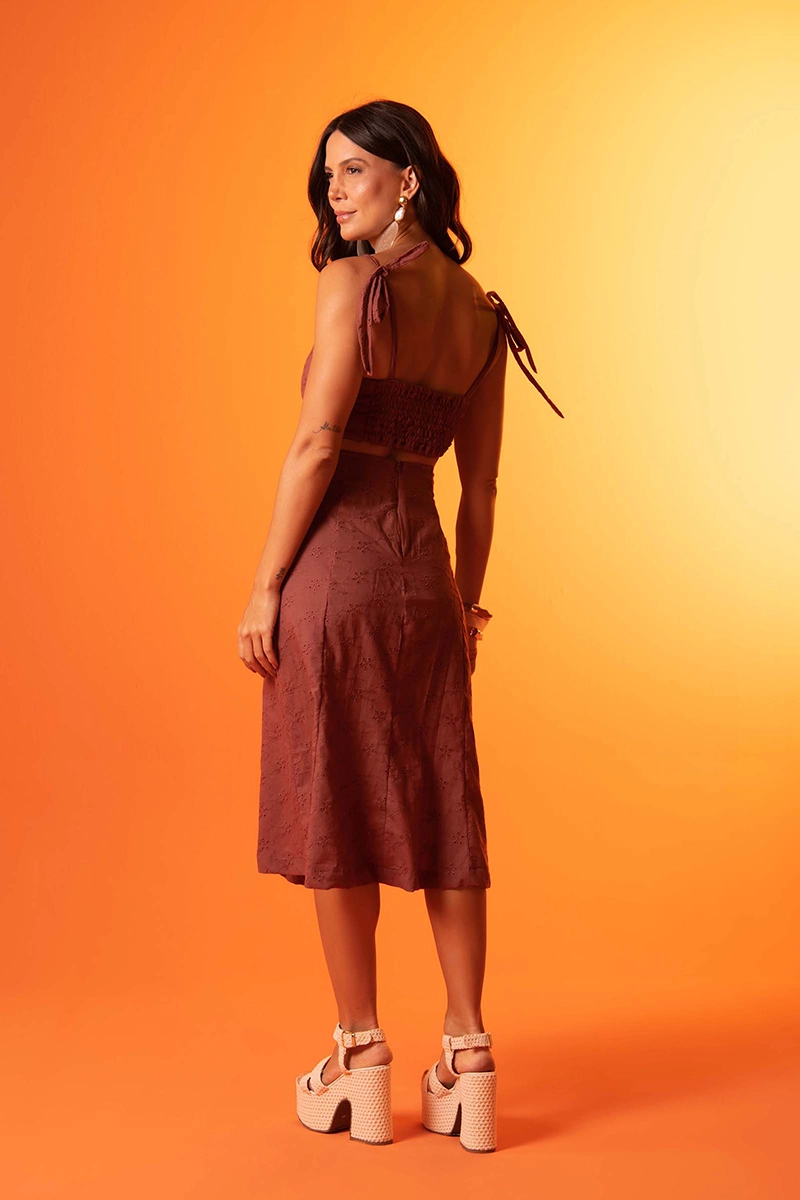 O Conjunto Marinna é confeccionado em laise leve, trazendo textura delicada e um visual naturalmente elegante. O top possui amarração nos ombros e lastex nas costas para ajuste confortável, enquanto a saia midi apresenta caimento fluido e amarração frontal na cintura. Um conjunto fresco, moderno e feminino, ideal para compor looks elegantes e descomplicados no dia a dia.