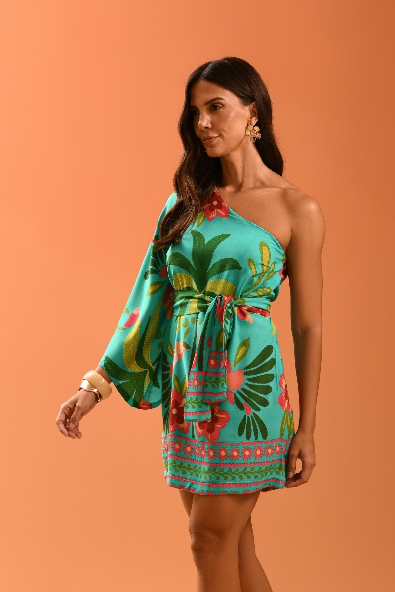 Vestido curto de um ombro só com manga longa flaire, barra levemente evasê. Acompanha faixa para acinturar a peça. Disponível em duas variantes. Fundo laranja e fundo azul.