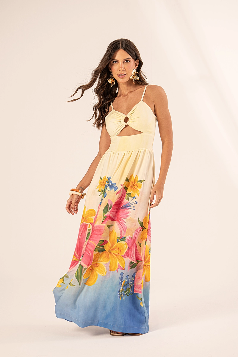 Este vestido em viscose sarjada une o toque macio do tecido premium a uma estampa floral exclusiva e recortes vazados (cut-out) no busto, garantindo um caimento fluido e sofisticado para produções de verão.