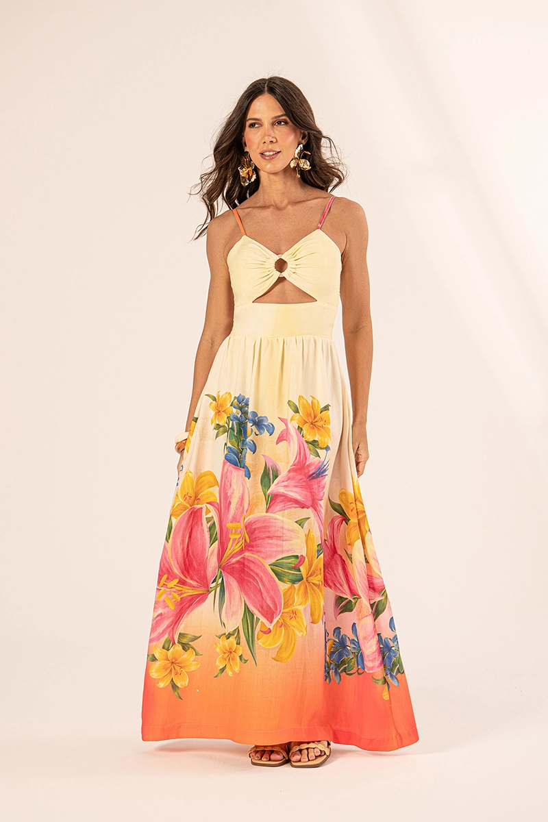 Este vestido em viscose sarjada une o toque macio do tecido premium a uma estampa floral exclusiva e recortes vazados (cut-out) no busto, garantindo um caimento fluido e sofisticado para produções de verão.