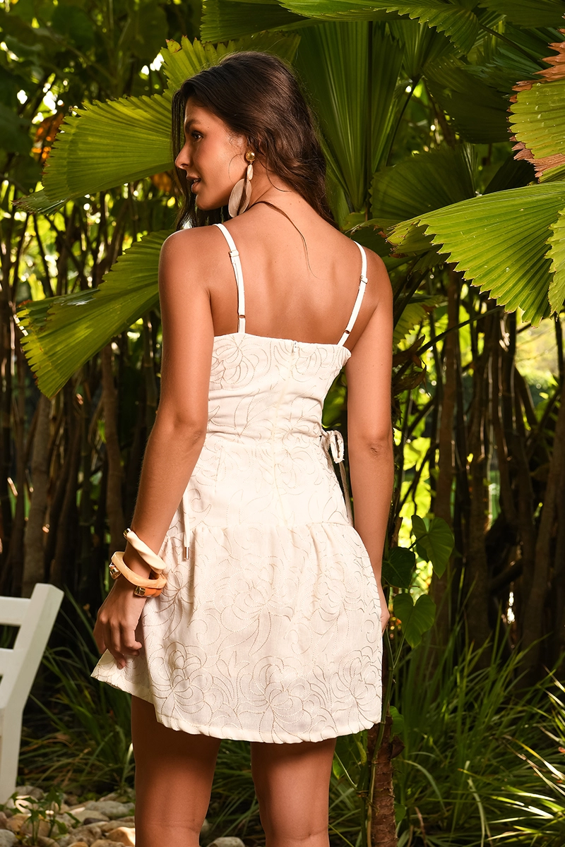 O equilíbrio perfeito entre o romântico e o moderno. Este vestido em tom off-white é uma peça-chave para quem valoriza detalhes artesanais e uma modelagem que celebra as curvas femininas com sutileza e elegância.
