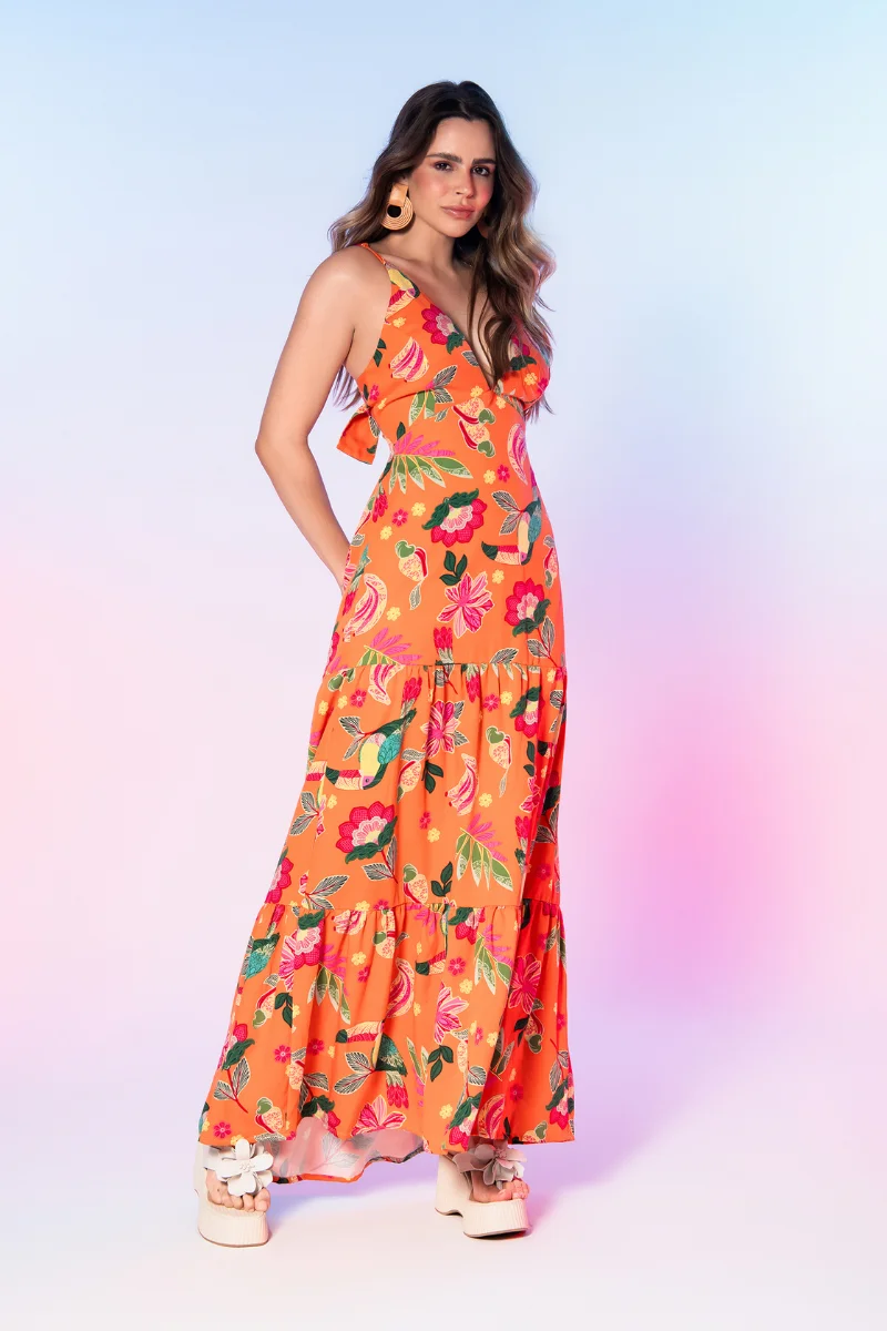 Vestido longo com decote em “V” pouco cavado, alças finas reguláveis, fechamento com amarração nas costas. A saia tem modelagem fluida com camadas em marias. Disponível em duas variações de estampa tropical: Laranja, Creme e Azul