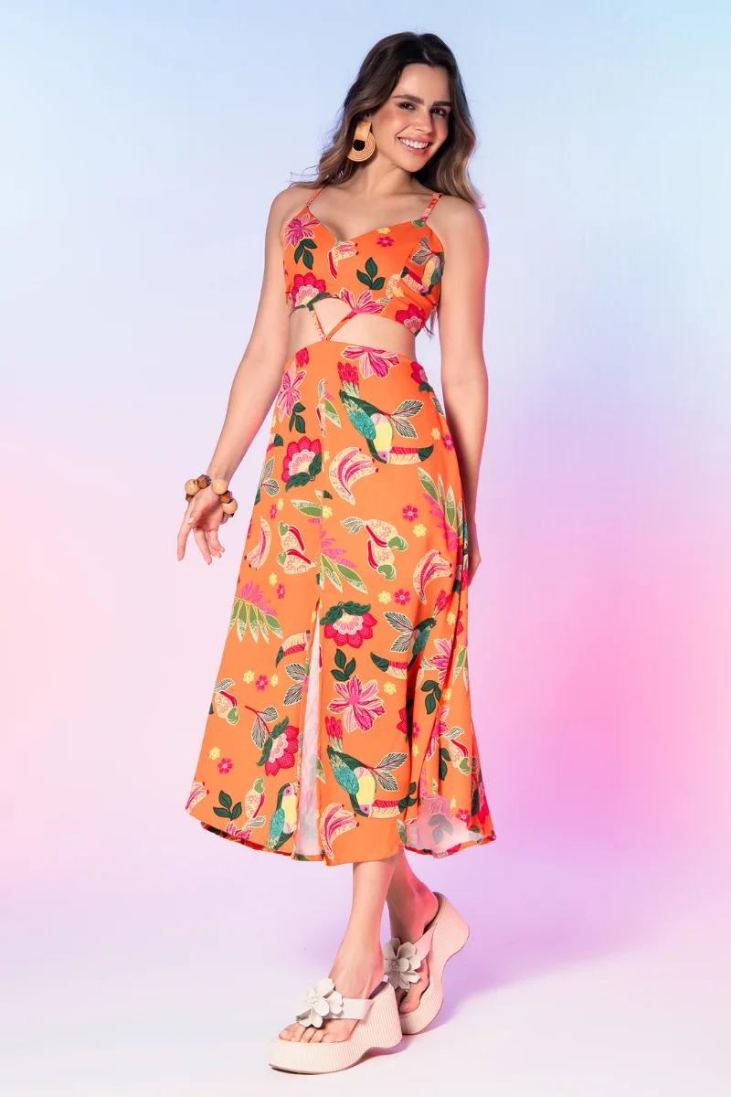 Vestido midi com recortes na cintura e alças finas ajustáveis. Parte superior em decote em “V” e busto estruturado com recorte lateral que forma abertura frontal e lateral na região da cintura, criando efeito cut-out. A saia possui modelagem evasê com fenda frontal. Disponível em duas variações de estampa tropical: Laranja, Creme e Azul.