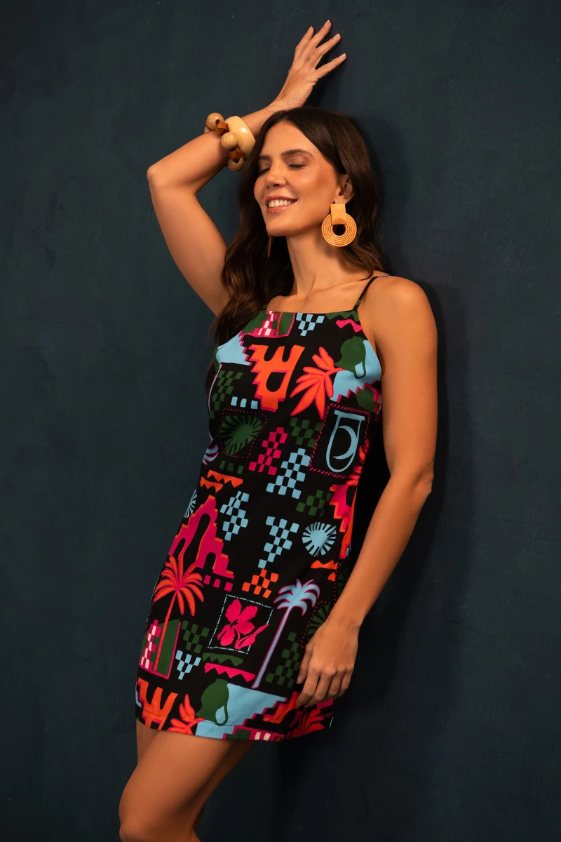 Vestido curto soltinho com alças finas reguláveis, detalhe de costas nuas.